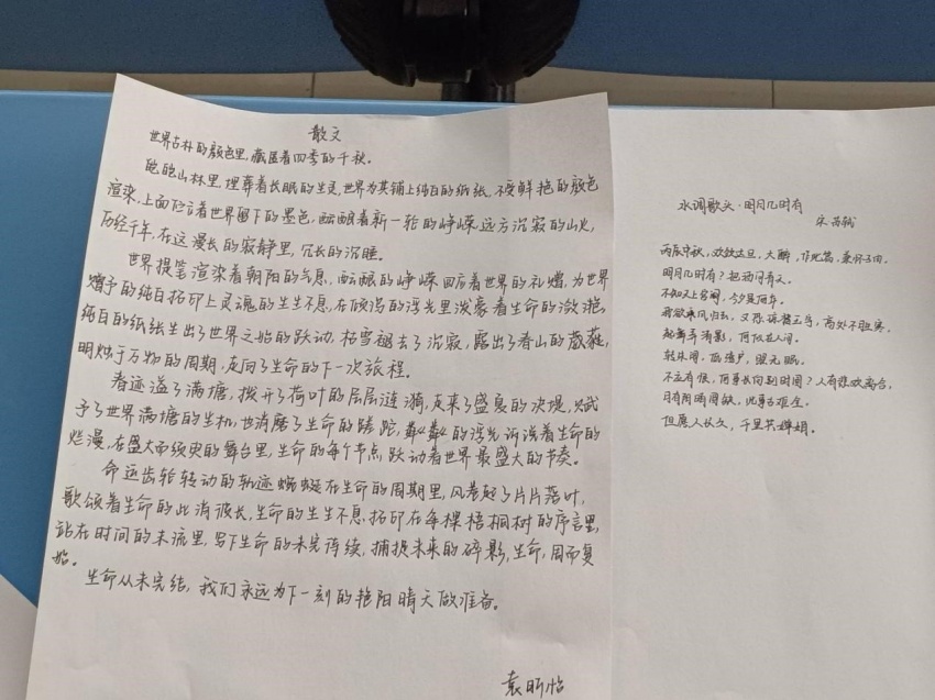 同学们自由发挥,选择自己喜欢的作品进行书写。有望月怀人的《水调歌头》,有优美秀丽的散文节选,有表达爱国之情的网络文字……短短的一页纸写不尽同学们的浓厚情感,却能体现同学们对书法的执着。“热爱可抵岁月漫长。”相信能写出如此优秀书法作品的同学也是在这样的信念下坚持下来的。